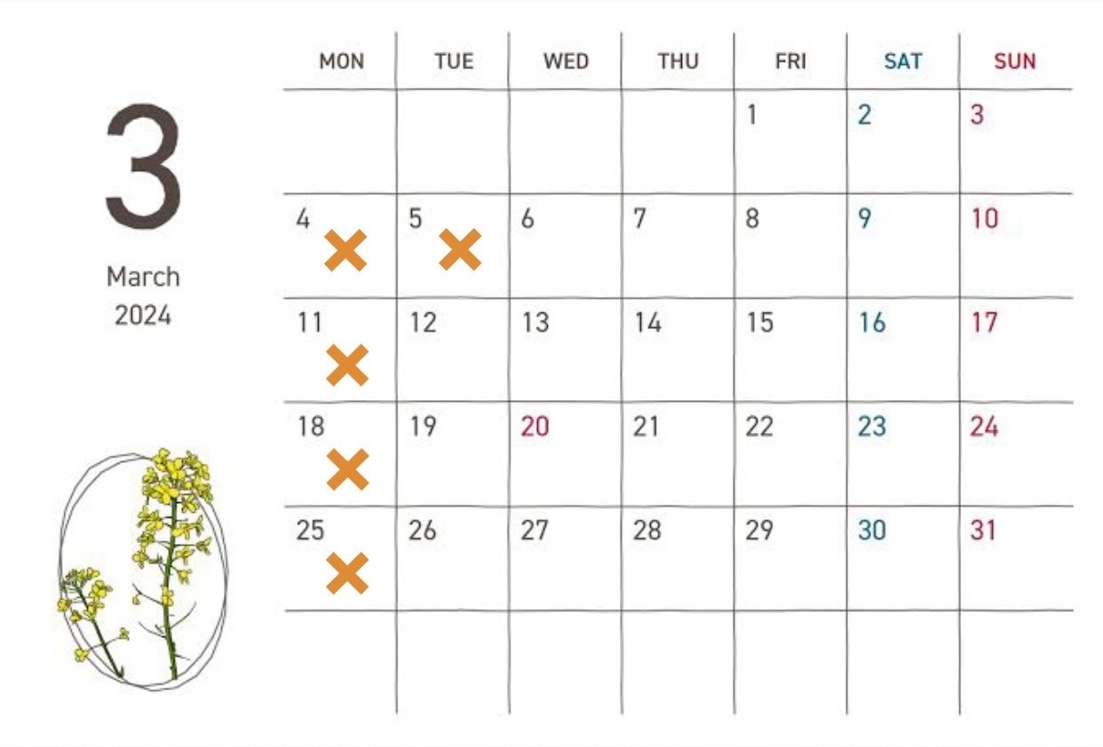 3月休業日のご案内|伊勢小俣店|三重トヨペット 2024.02.23 三重トヨペット 休業日 3月休業日のご案内 こんにちは!伊勢小俣店です🐥 今回は 3月休業日 のご案内です! 4日(月) 5日(火) 11日(月) 18日(月) 25日(月) 誠に勝手ながら上記の日程で お休みさせていただきます🙇♀️ 事故・故障等でお困りの際は 三重トヨペット事故・故障サポートセンター ☎ 0120-83-7171 までお電話をお願いいたします🙇♀️ ご不便をおかけしますが 宜しくお願い致します。 🐥伊勢小俣店一同🐥 前の記事へ 店舗ブログ一覧に戻る 次の記事へ