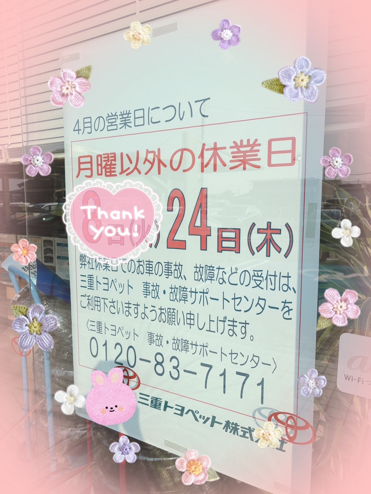 4/24は休業日です!|四日市生桑店|三重トヨペット 2025.04.23 三重トヨペット TOYOTA 四日市市 こんにちは! 四日市生桑店でございます。 明日 4/24(木) 社内行事のため 休業日とさせて いただきます ご不便おかけいたしますが よろしくお願いいたします。 四日市生桑店 前の記事へ 店舗ブログ一覧に戻る 次の記事へ