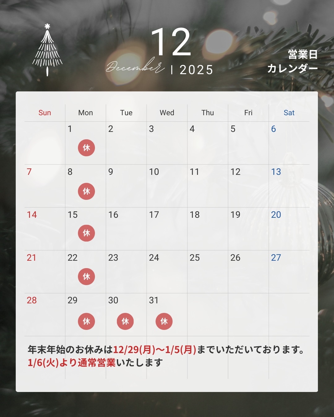 12月定休日のお知らせ🎄🥂|員弁東員店|三重トヨペット 2025.11.30 三重トヨペット 休業日 冬季休業日のご案内 年末年始 員弁東員店 皆さんこんにちは いつもブログをご覧いただき ありがとうございます! 12月定休日のお知らせです📣📣 毎週月曜日と 12/30㈫・12/31㈬が定休日と なっております📣📣 また、年末年始のお休みを 1/5㈪までいただいております⛩️ 事故・故障等でお困りの際は… 三重トヨペット 事故・故障サポートセンター 📞0120-83-7171 ご不便をおかけいたしますが 何卒宜しくお願い致します。 前の記事へ 店舗ブログ一覧に戻る 次の記事へ