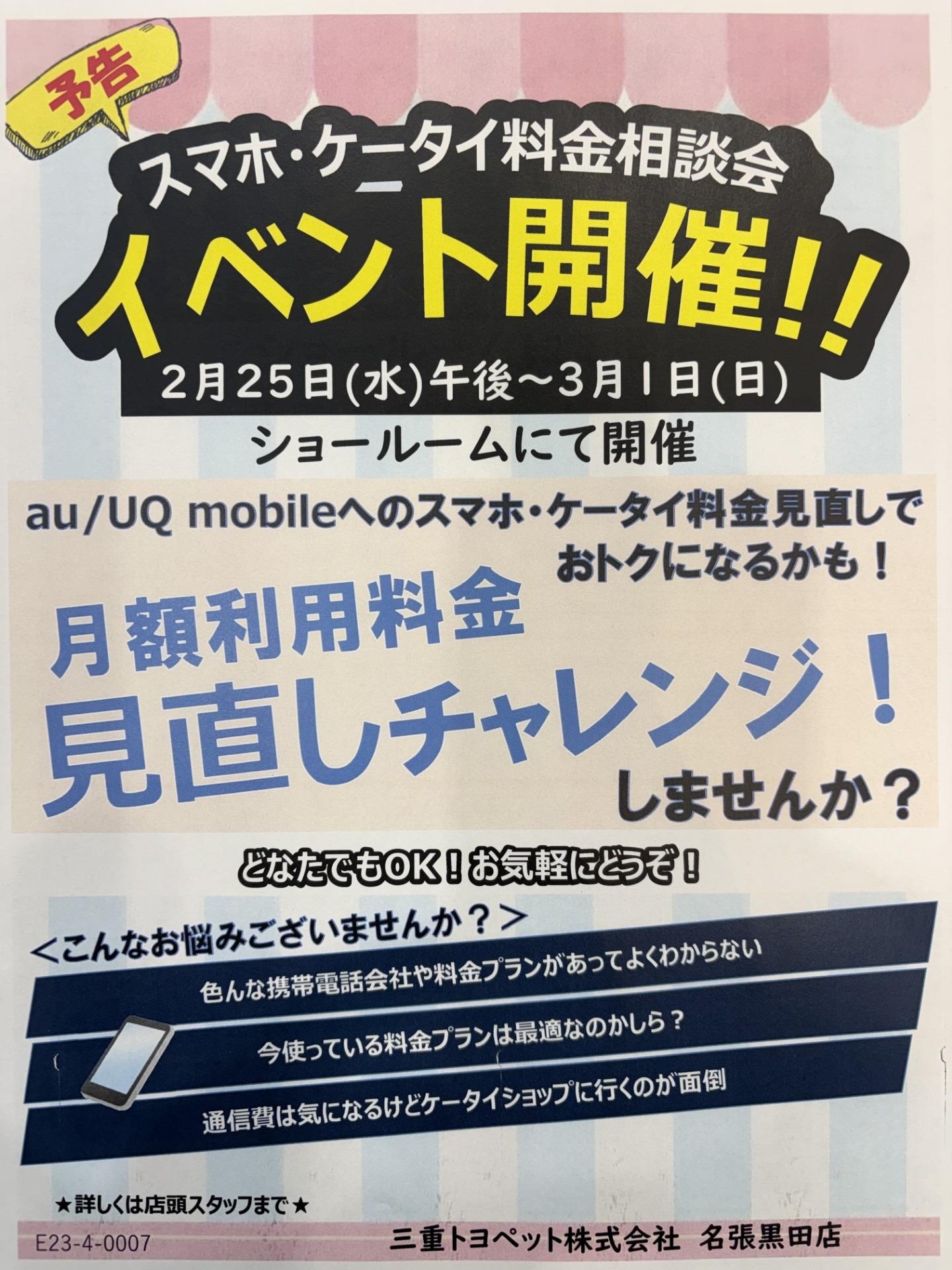 スマホ・ケータイ料金相談会|名張黒田店|三重トヨペット 2026.01.23 こんにちは🙌 名張黒田店でございます🤗 今回は スマホ・ケータイ料金相談会の イベント開催の お知らせです📢 当店は au/UQ mobile の取り扱い店でございます✨ 2月25日(水)午後 ~3月1日(日) この機会に ケータイ料金を見直し してみませんか❓ au/UQ mobileはもちろん 他キャリアご利用の お客様も大歓迎です✨ 期間中は 専門スタッフも一緒に 対応させていただきます📲 前の記事へ 店舗ブログ一覧に戻る 次の記事へ