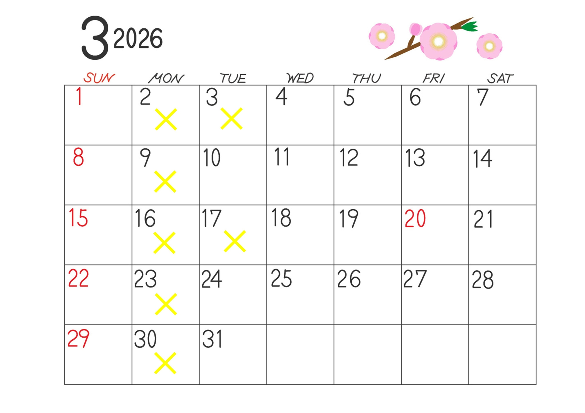 3月は休みが多くなっており、2,3,9,16,17,23,30日となっております。