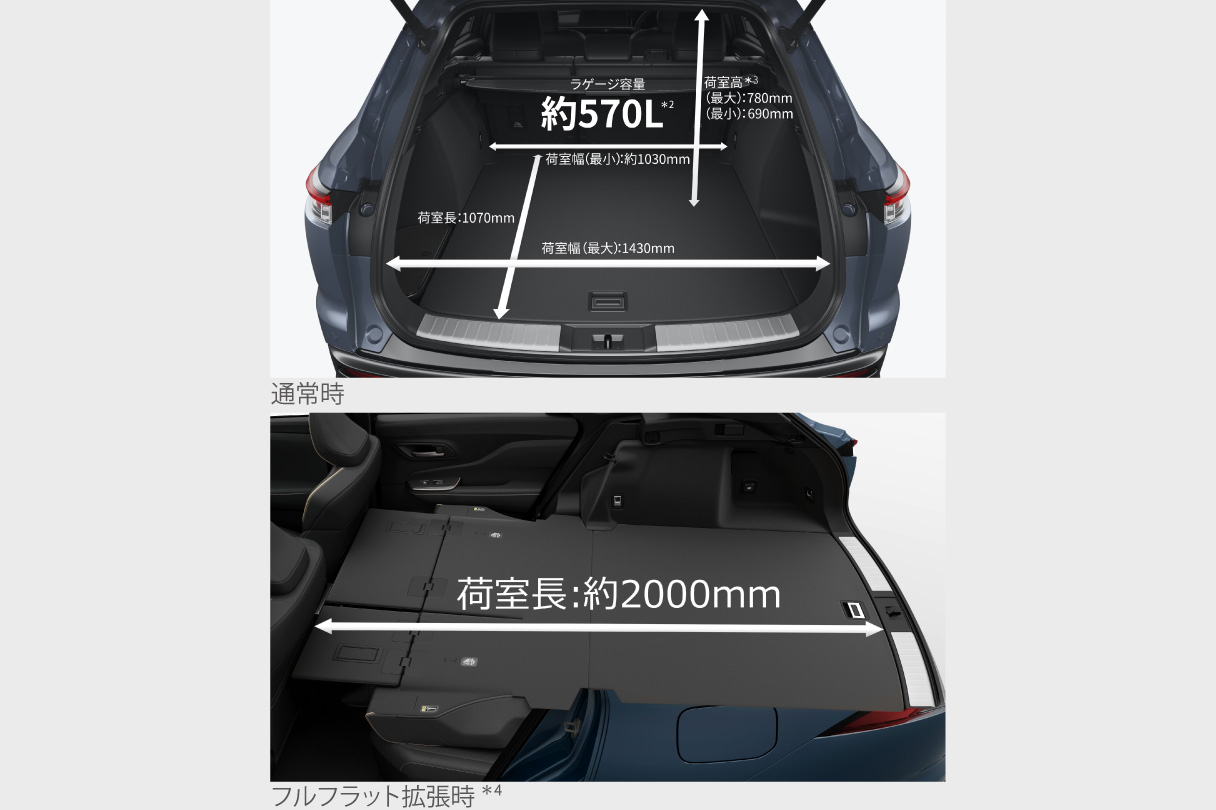 通常時は9.5インチゴルフバッグを3個*1、81cmスーツケースを2個*1まで収納可能です。ラゲージルーム拡張ボードを使用したフルフラット拡張時では、車中泊などといったレジャーシーンにてより快適に過ごせる広さを確保します。